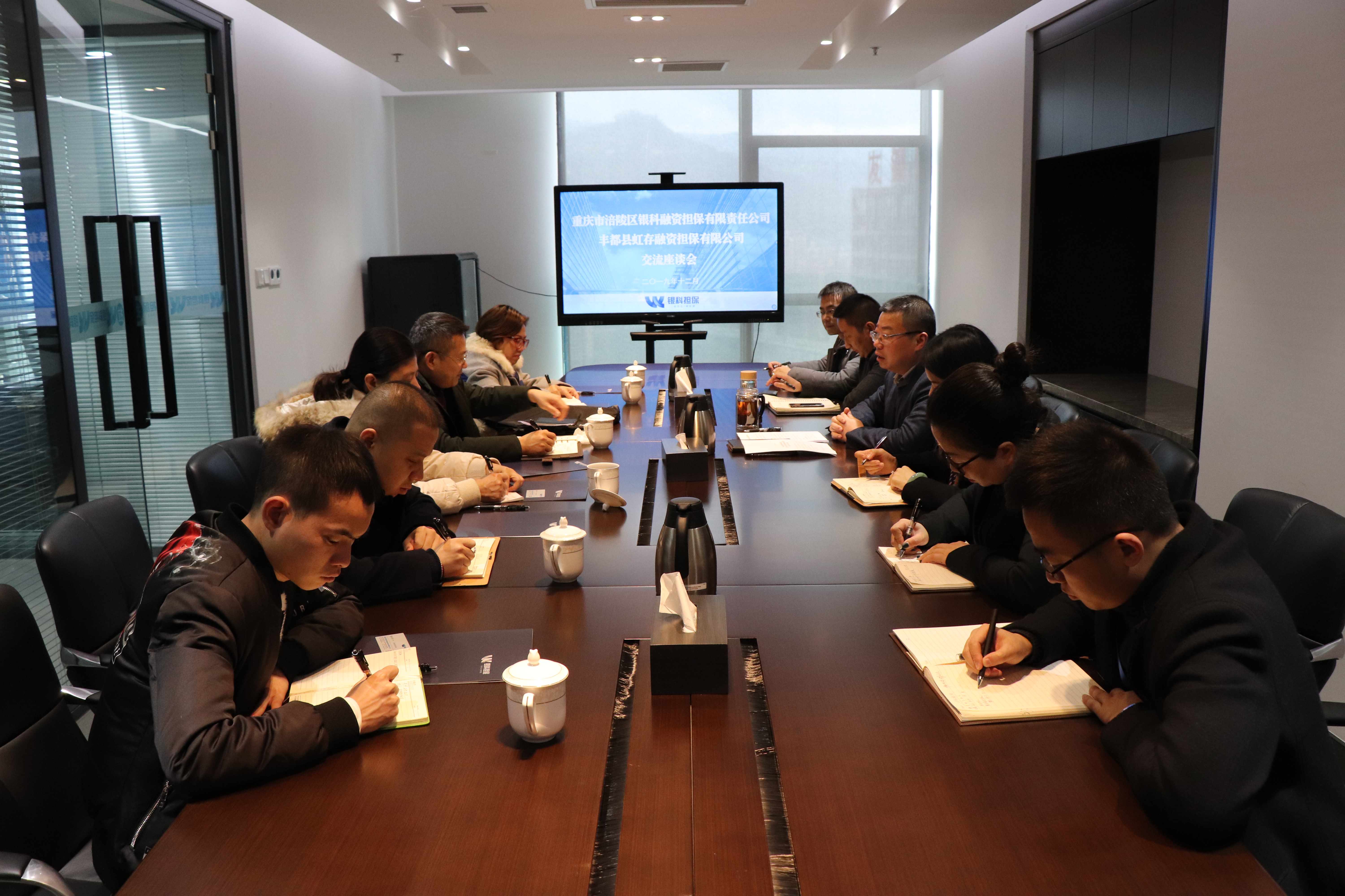 12月19日上午,丰都县虹存融资担保有限公司董事长许余飞带领公司高管及各部门负责人一行到我公司进行交流学习。董事长谢晖介绍了公司基本情况和业务概况,同时双方就新形势下非融担保业务开发、操作流程及风控要点等内容进行了深入探讨。